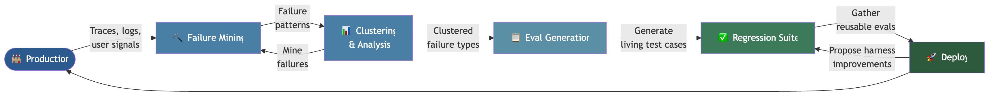 - The feedback loop architecture: Production Traces → Failure Mining → Clustering → Eval Generation → Regression Suite → Harness Improvements → Deployment → Production